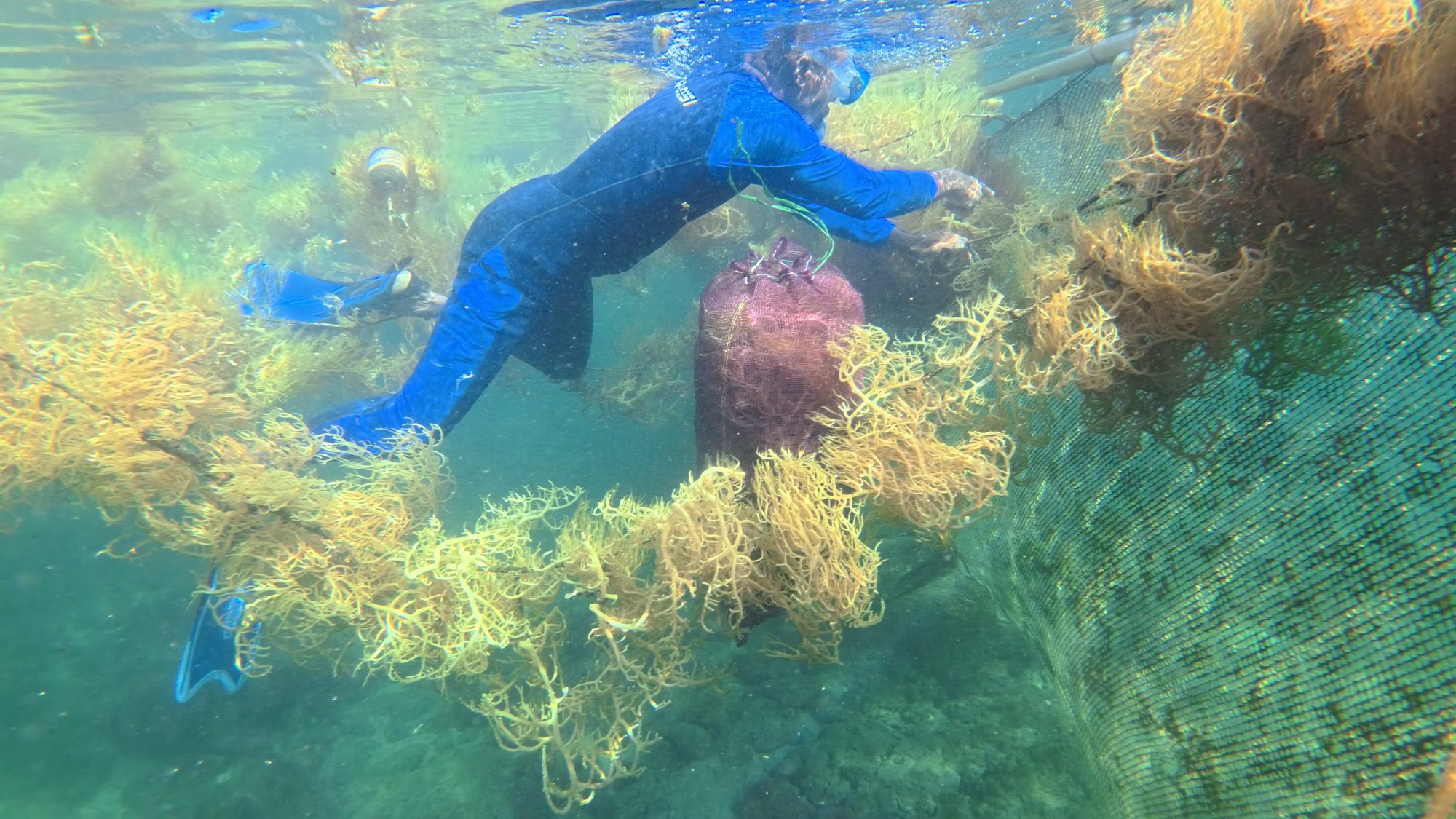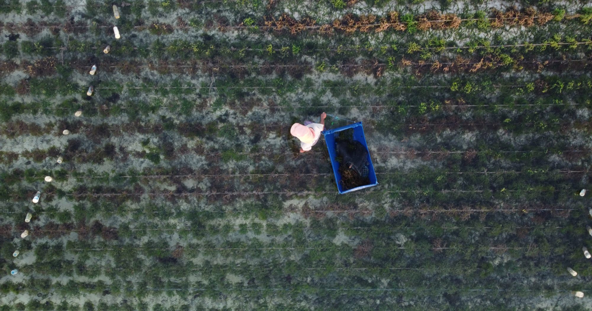 The harvesting process is logistically demanding, with the work being conducted from boats, floating raft systems which double as work platforms, or accessed on foot at low tide. The seaweed is in most cases manually cut from the lines and immediately placed into floating baskets or large floating bags positioned alongside the workers to keep the biomass in the water and prevent deterioration.