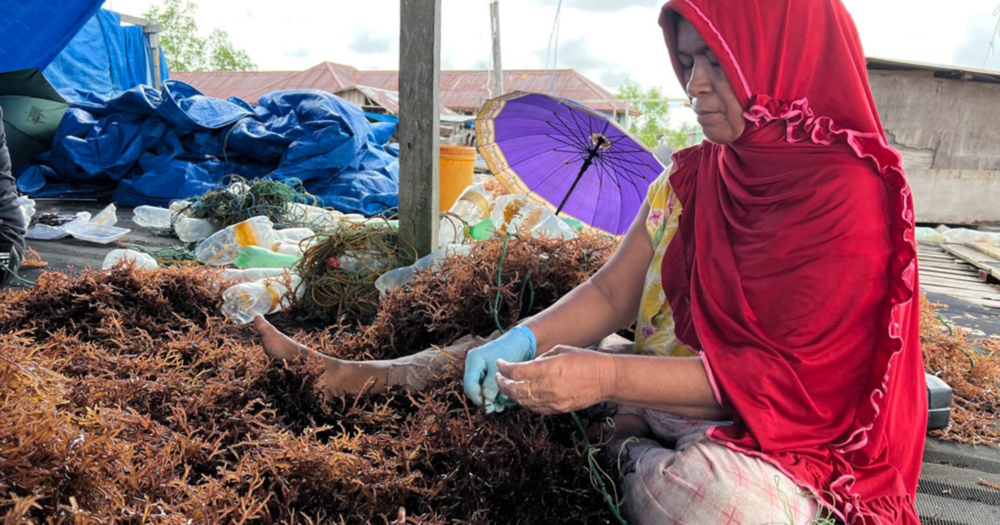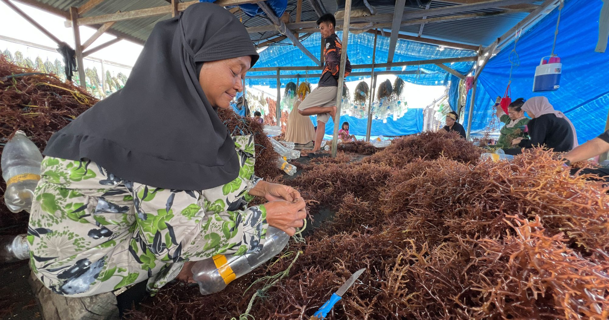 Tying the seedlings to the culture line is either done by family members or paid workers, in most cases from the same community, that are paid per piece or line. It is the most labour intensive process in Eucheumatoid farming. Anyone can do the tying, but across all regions, women do the majority of tying.