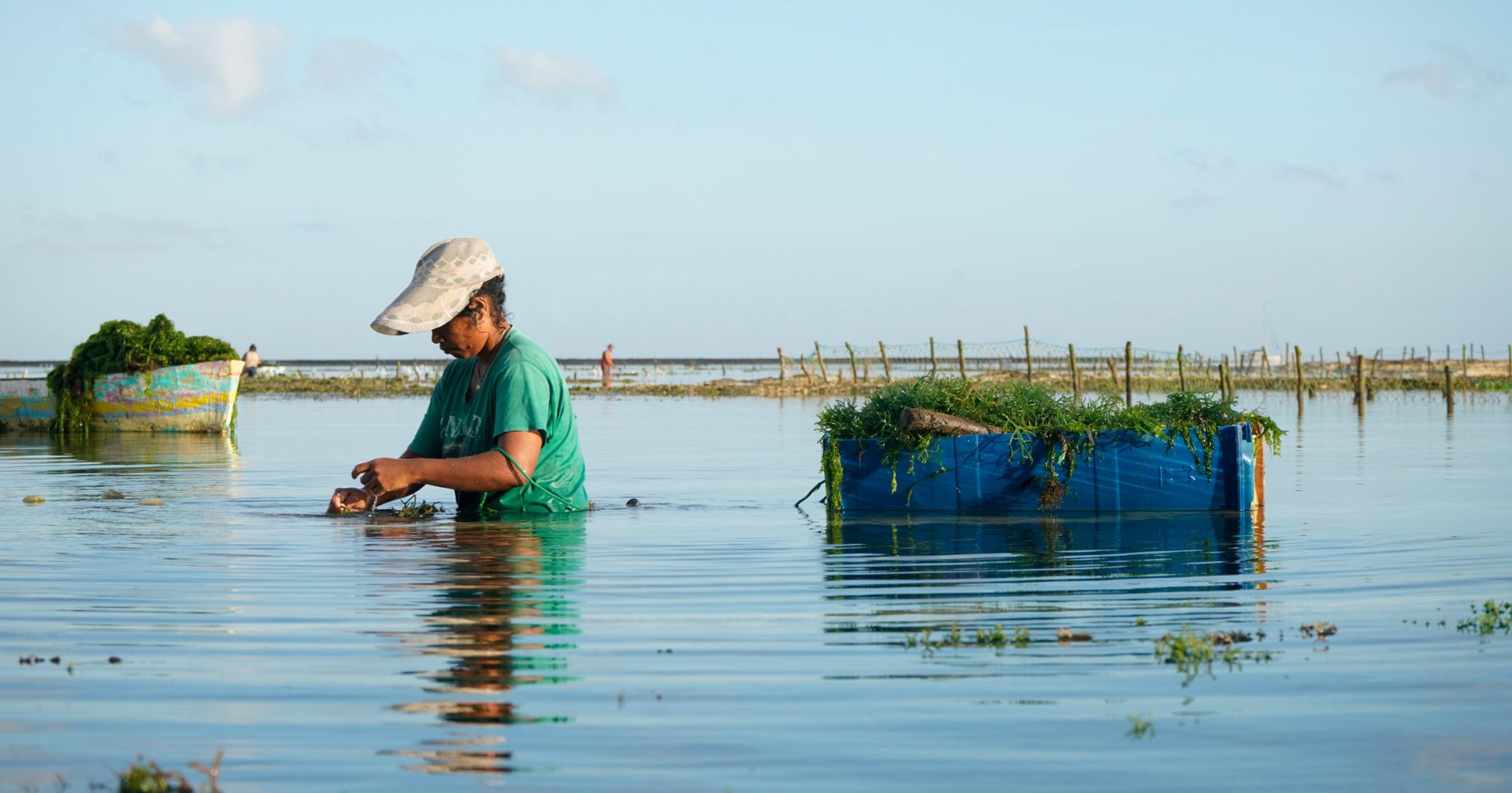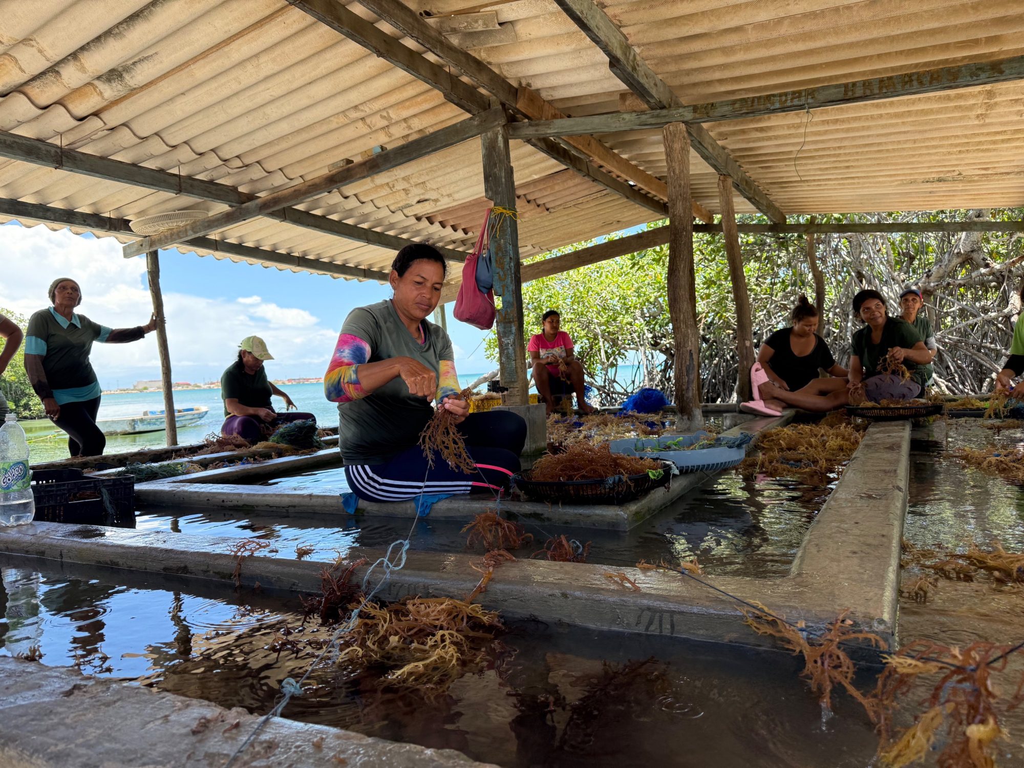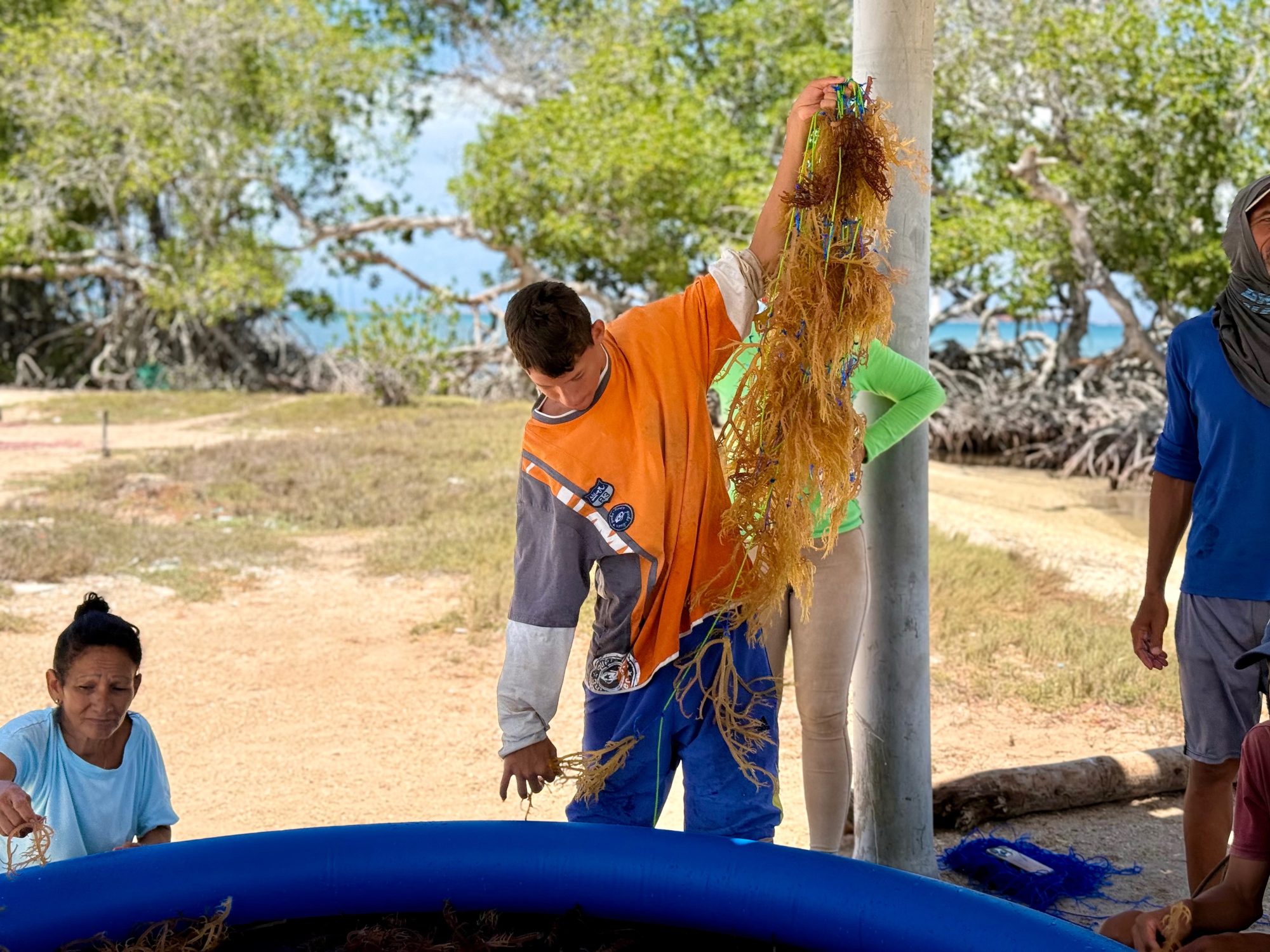 Tying seedlings to culture lines is labor-intensive. This work is often carried out by family members or local workers, with women frequently leading the tying. On most Caribbean islands it’s done at sea.