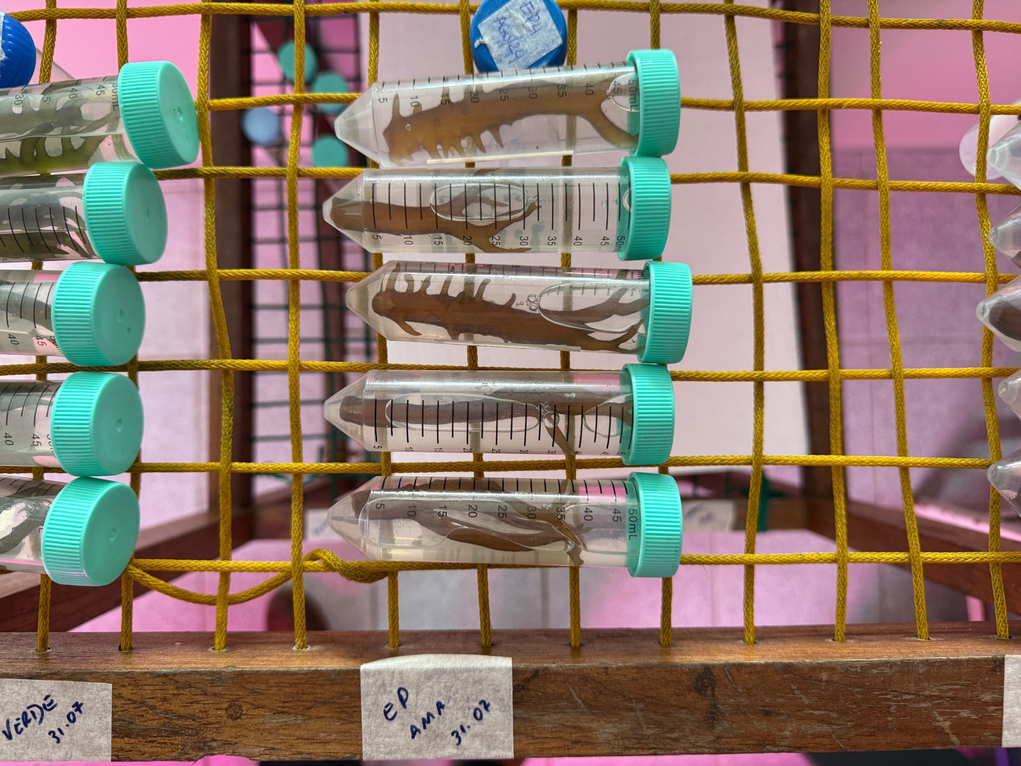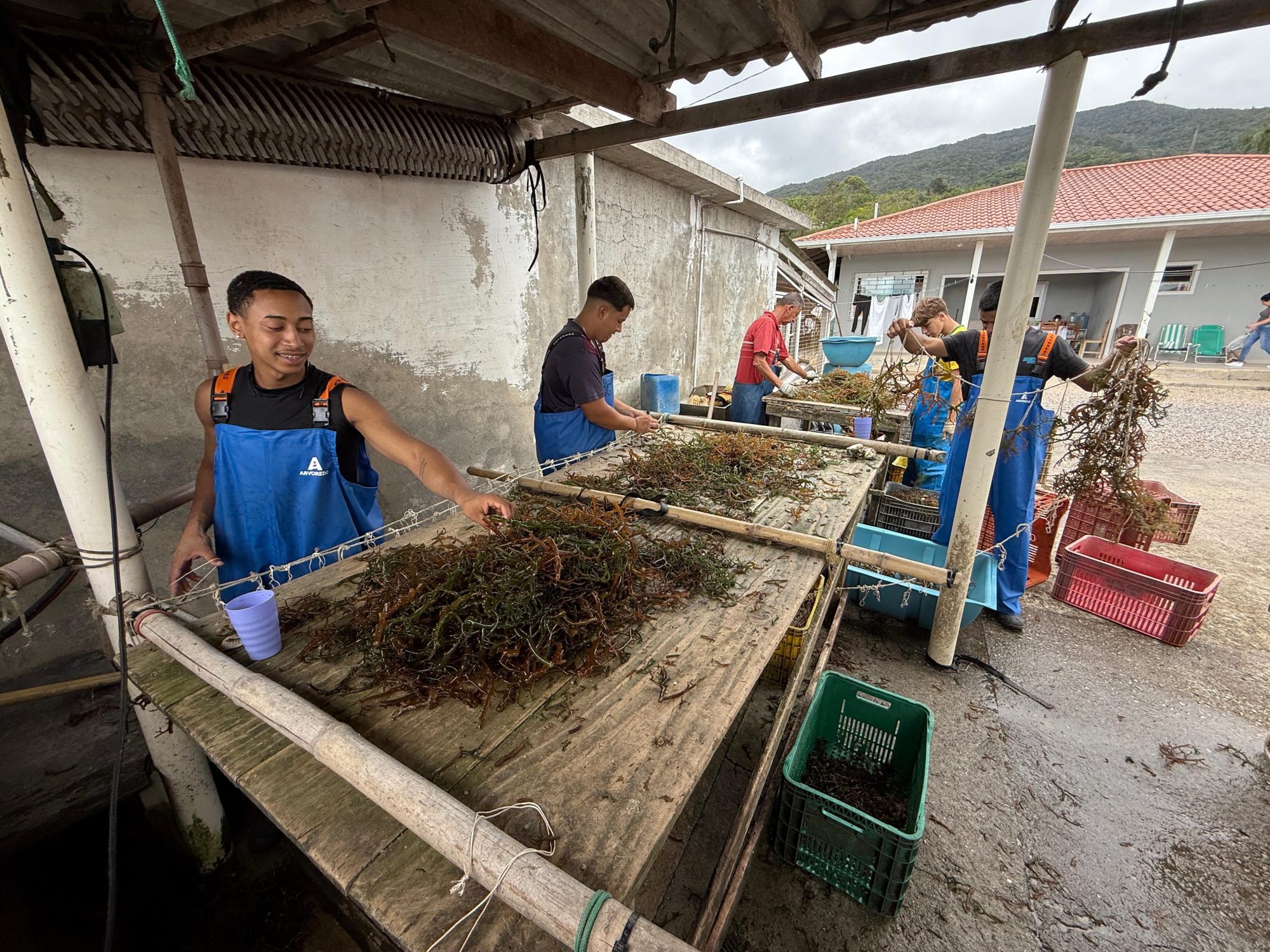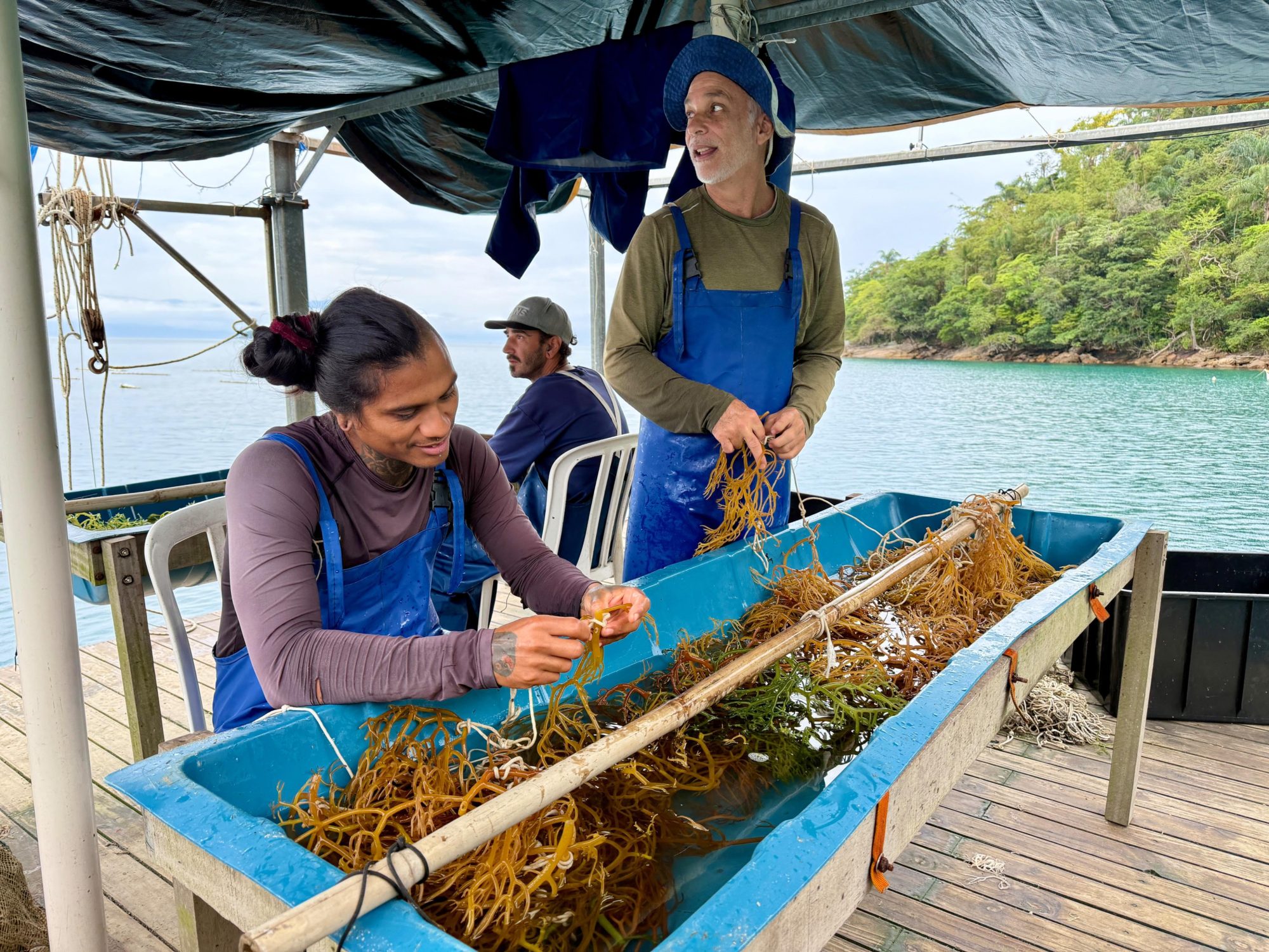 In Brazil, the standard tie-tie method is employed, though its application varies. In Rio de Janeiro, tying occurs on land, floating platforms, or in containers to keep the seaweed hydrated. In Santa Catarina, are typically paid one Real for every meter of line they plant, and a single worker can produce around 200 meters per day, providing significant community income.