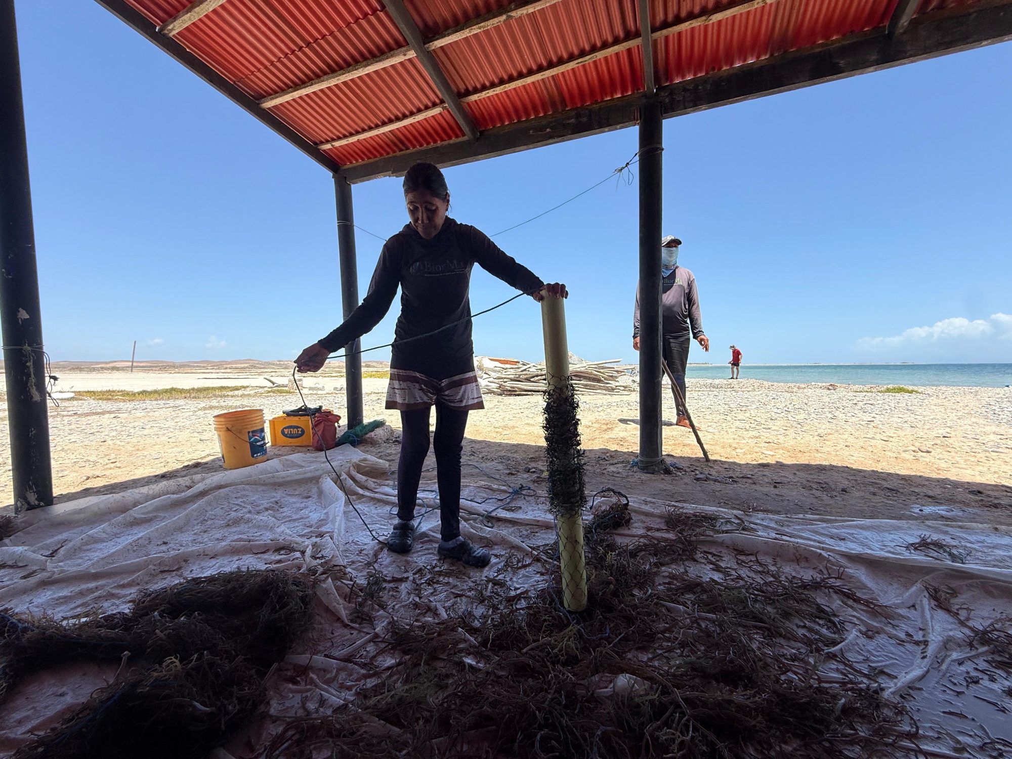 In Venezuela, this labor-intensive task is predominantly carried out by women on land, mirroring practices in Asia. TIDE conducts this work on land using specialized structures designed for comfort and to minimize seed damage, by keeping the seed material hydrated. At TIDE's seedling nurseries, teams of 25 to 30 women prepare an average of 500 lines (each 25m) per day. For tying the propagule on to the cultivation lines, the slipknot method is the most widely used technique across the country, with the exception of Biorma, which uses the tubular net method.