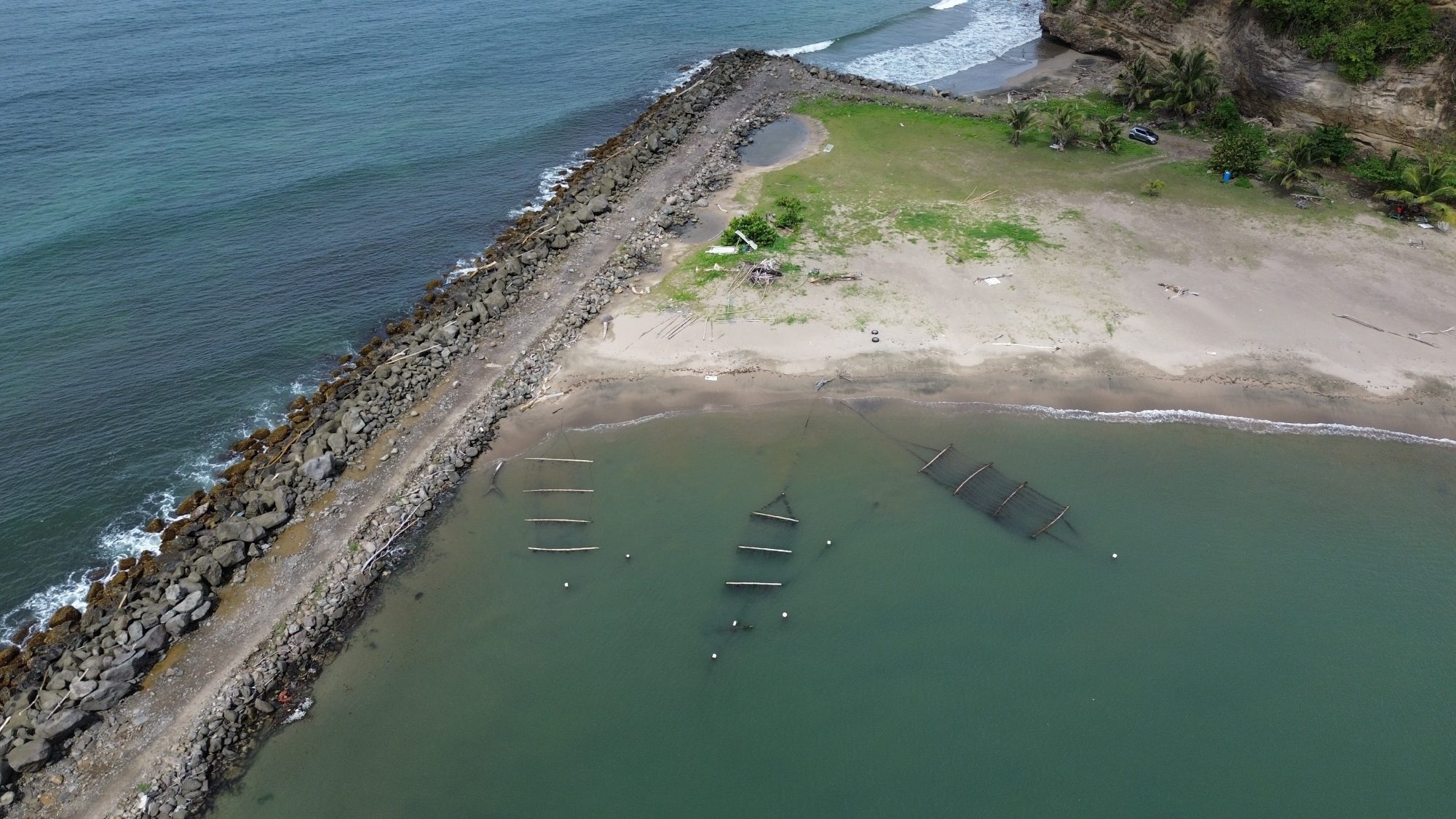 The annual influx of sargassum is a key factor influencing seaweed farming site selection in the Caribbean, often prompting farmers to seek less affected areas or relocate their farms. To reduce risks, they favour sheltered sites protected by reefs or mangroves and avoid the Atlantic Ocean side, which is more exposed to swells and hurricanes, the major threats capable of wiping out entire farms and stocks.