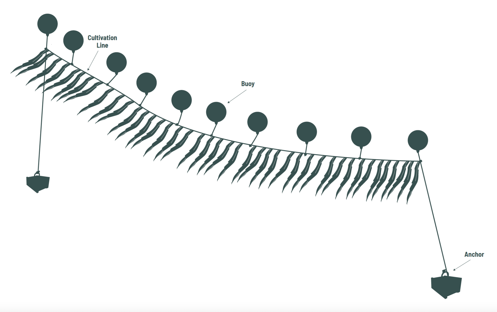 In the longline method, the farm-rig is traditionally secured using stone bundles, concrete or wooden stakes, though excessive stake use can cause ecological issues like sediment accumulation. Hydro-anchors are used increasingly; they are installed using water pressure at a fraction of the cost of traditional concrete blocks and can be deployed rapidly.