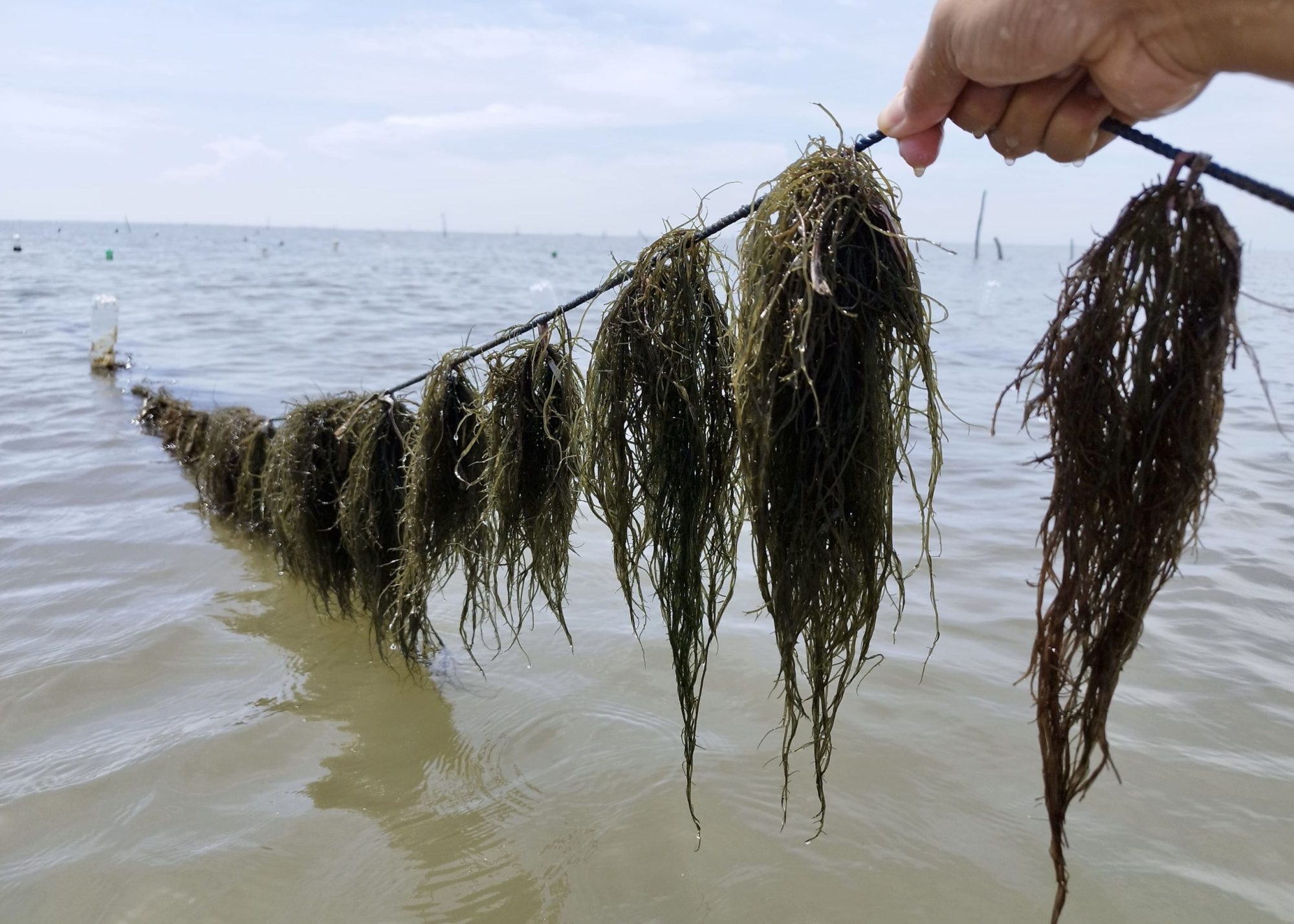 In pond culture, these seedlings are simply scattered across the grow out pond. When farming Gracilaria at sea on ropes, the seeding process is highly labour intensive. In Indonesia, fragments will be tied to the culture line, which uses the same materials and technique as seeding the lines for Eucheumatoids farming. In China, the fragments will be inserted into the twisted rope, just like in the seeding process for Saccharina.