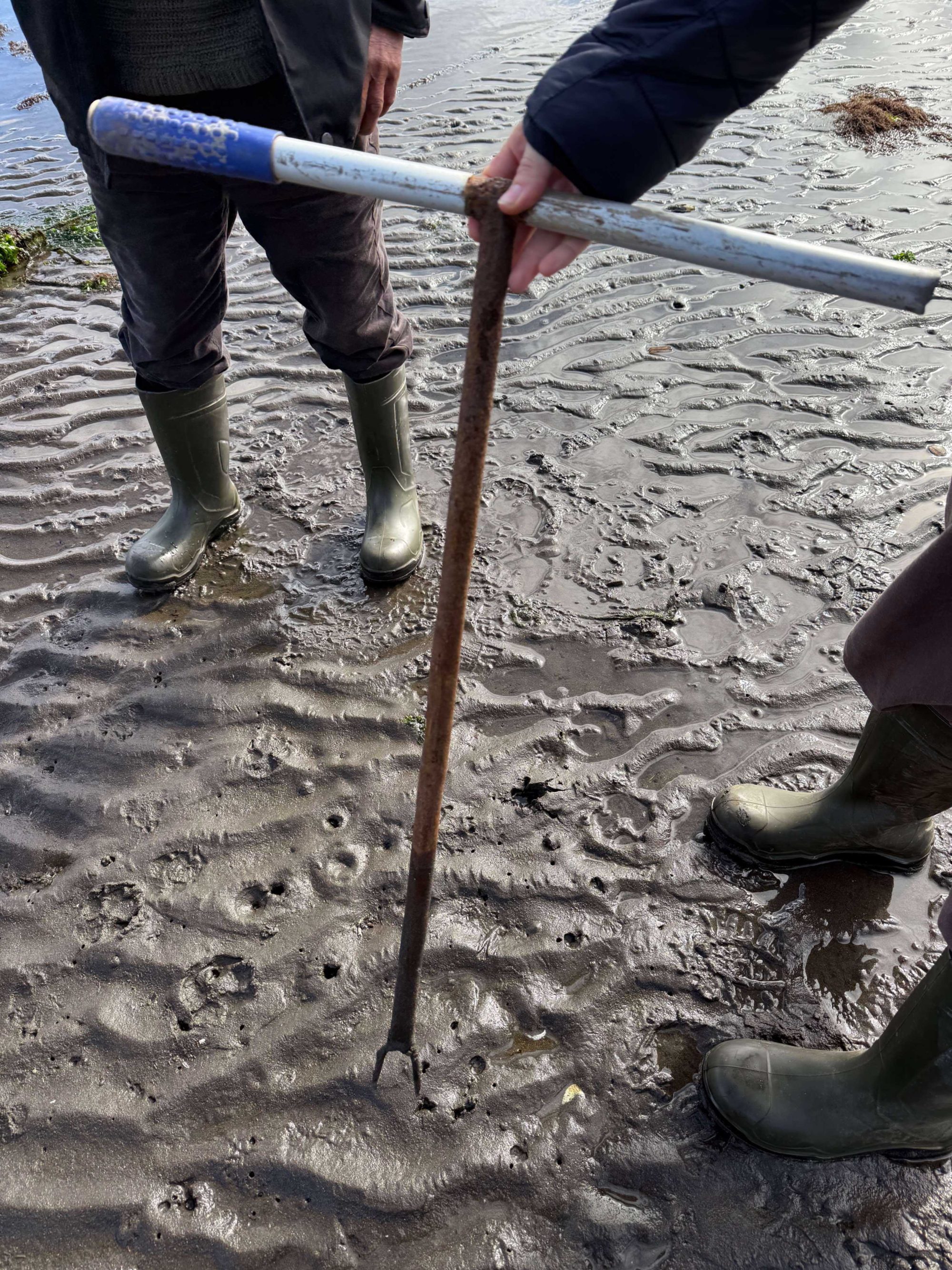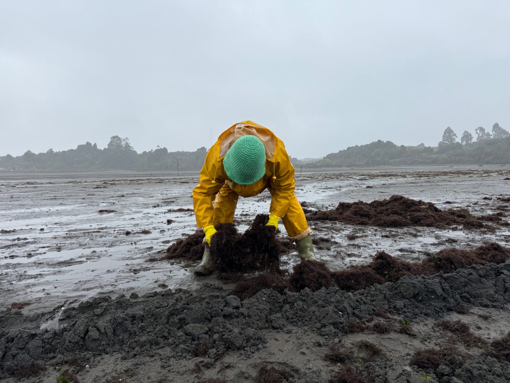 In suitable intertidal areas, mechanised sowing with tractors significantly enhances efficiency, enabling teams of 2-3 people to plant up to 1000 kg during a single 2-3 hour low tide cycle, though this advanced approach is currently limited to only two such tractors in the region of Los Lagos. The recommended seeding density ranges from 1 kg per linear meter to 1-2.4 kg per square meter to compensate for establishment losses.
