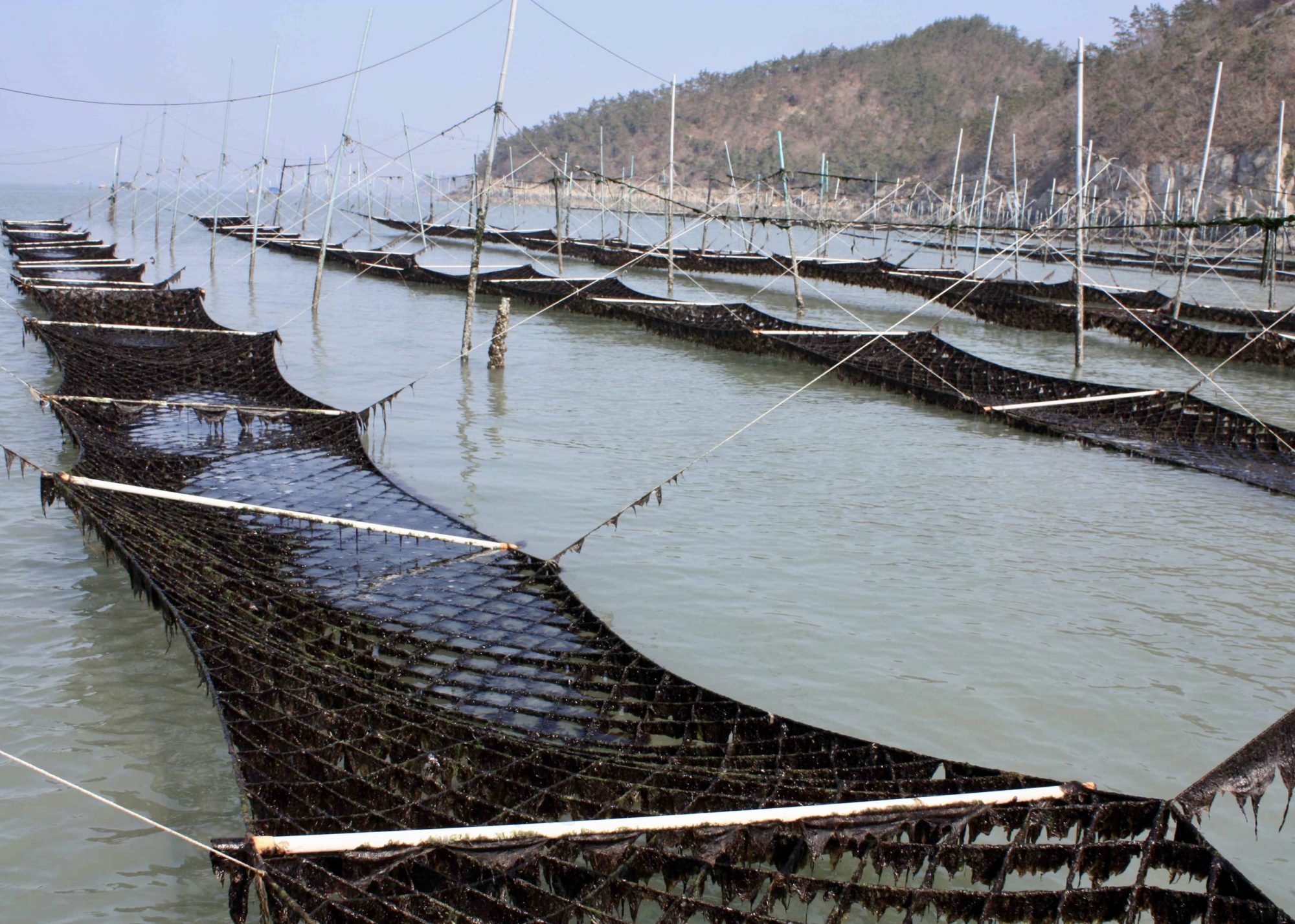 Fixed net cultivation – This method is most suited for the intertidal zones of the Yellow Sea. At sites with lower water depths, the fixed net method or ‘pole’ method is preferred, as it naturally exposes the nets to air at low tide. This method is limited to the shallow sites on a coastline.