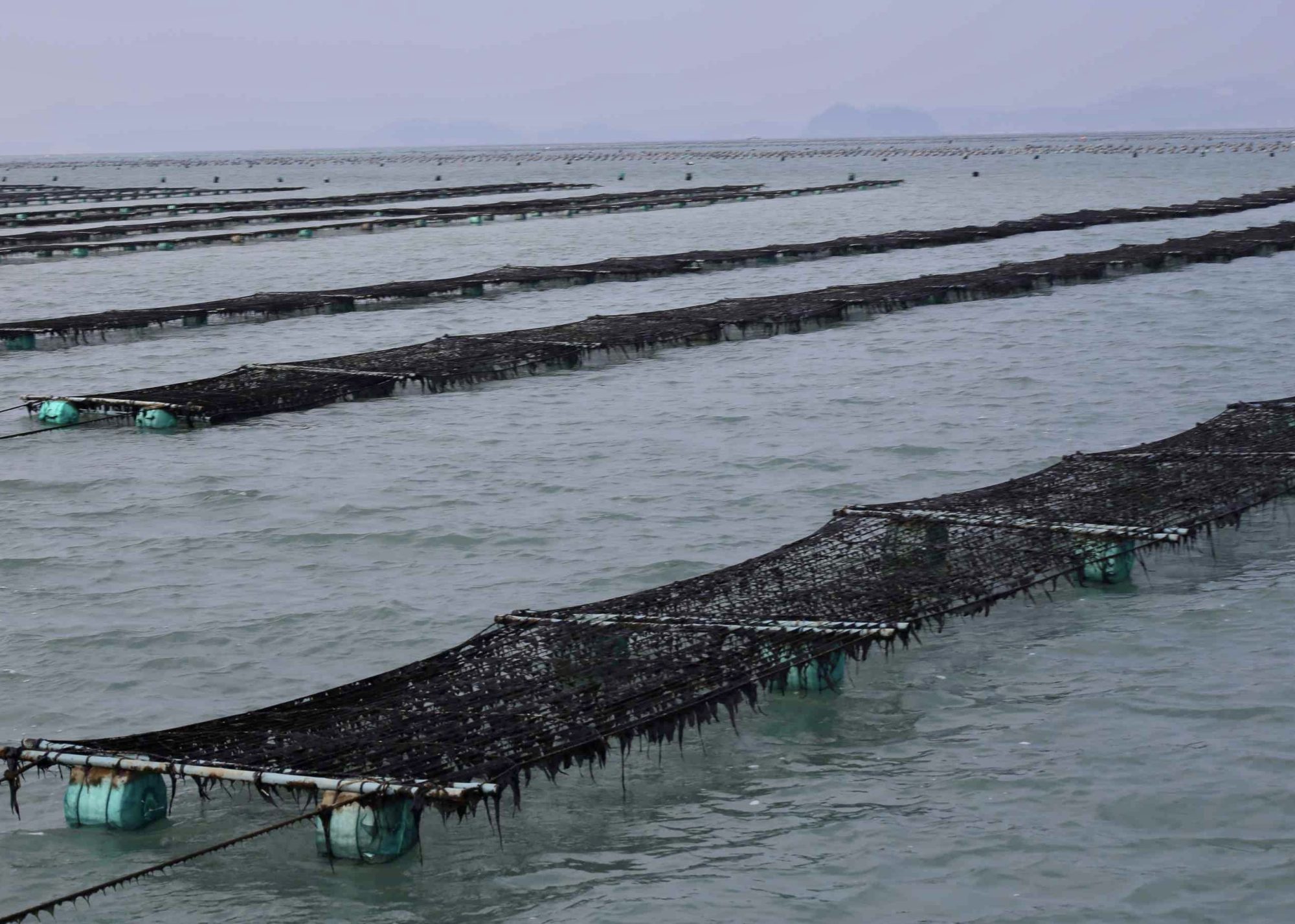 Floating (turnover) net cultivation – This method can be used further offshore at water depths up to 15 m. Unlike the above methods, the nets won’t be above the water through tide cycles – farmers need to overturn the raft manually when necessary.